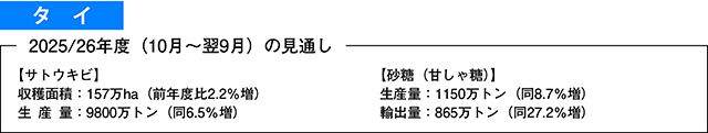 砂糖生産量は、サトウキビの増産とCCS(注)の上昇により、1150万トン(同8.7%増)とかなりの程度増加が見込まれている。しかし、年末年始にかけての製糖工場における圧搾作業の中止やカンボジアとの国境閉鎖に伴う労働力確保の問題などで収穫および圧搾作業に遅延が発生していることから、26年2月時点の累計生産量は前年度を下回って推移している。砂糖輸出量は、砂糖の増産を背景に865万トン(同27.2%増)と大幅な増加が見込まれている。