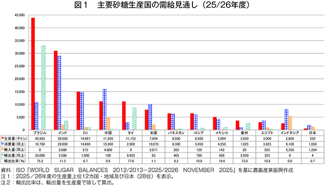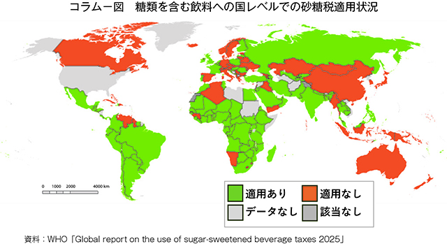 コラム 砂糖税をめぐる世界の状況世界保健機関(WHO)は2026年1月、「糖類を含む飲料税に関するグローバル報告書(Global report on the use of sugar-sweetened beverage taxes 2025)」を公表した。これによると、24年7月時点で、世界116カ国において1種類以上の糖類を含む飲料に国レベルの砂糖税(コラム注)が課されている(コラム−図)。(コラム注)一般的に糖類を含む飲料や食品に対する課税のこと。導入国ごとに税制の正式名称は異なる。 ![]() このうち、114カ国で糖類を含む炭酸飲料が課税対象となっている。地域別では、アフリカ地域で糖類を含む飲料への適用率が最も高く、対象47カ国の89.4%(42カ国)が導入している。これに続くのが東地中海地域(17カ国中13カ国:76.5%)、東南アジア地域(8カ国中6カ国:75%)、南北アメリカ地域(33カ国中22カ国:66.7%)、西太平洋地域(24カ国中12カ国:50%)、欧州地域(50カ国中21カ国:42.0%)である。また、所得階層別では、低所得国が最も高い適用率(21カ国中20カ国:95.2%)を示している。 報告書では、経済成長に伴う物価上昇の中で飲料価格が据え置かれた場合、糖類を含む飲料が一層手頃な価格となり、入手しやすさが高まることで消費増につながる点を指摘している。このような消費の拡大は、過体重や肥満の有病率と関連する要因と位置付けており、砂糖税などの税制政策は価格を引き上げ、入手しやすさを抑制する効果的な手段であるとしている。 以下に主要国の砂糖税の概要を取りまとめた(コラム−表)。 ![]() 一方、WHOが2015年に公表した「糖類摂取ガイドライン」は、「糖類の完全排除」ではなく、「健康リスクを避けるための上限設定」を目的としている。すなわち、「糖類はゼロにすべきもの」ではなく、「摂取量を適切に管理すべきもの」との立場である。また、糖類の中には砂糖のようにエネルギー源としての機能に加え、脳内の神経物質に働きかけてリラックス効果をもたらすなど、一定の有効性が報告されているものもある。問題となるのは、あくまでも「一定量を超えた過剰摂取」である。 他の食材の事例を見てみると、例えば乳製品のバターは、かつて健康への悪影響が懸念され、長く消費が伸び悩み、「脱脂粉乳の副産物」とまで言われた時期があったものの、14年に米「TIMES」誌で「バターの脂肪は健康に良い」との報告が紹介されたことなどを契機に、健康的な食材として再評価が進み、世界的に消費が拡大した例がある。 どのような食材であれ、過度な摂取が健康に影響を及ぼす可能性がある点は共通であり、砂糖税のような強い政策措置を通じて消費の削減を迫られる状況は、食生活や食文化が十分に機能しない兆候とも言えるのではないか。今後、研究や調査の進展によって砂糖を含む糖類が再評価される可能性もある。従って、その有効性や有益性、適切な摂取量など、科学的根拠に基づく正確な情報を発信することが求められている。 |