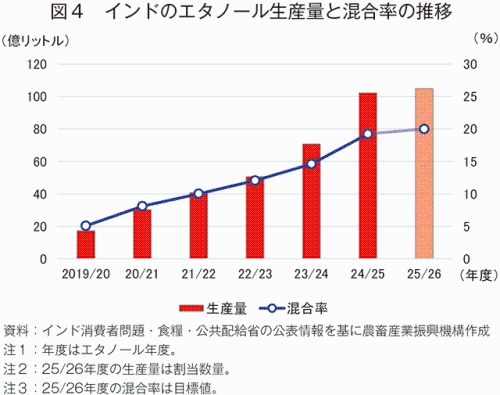 同国のエタノール生産に占めるサトウキビ由来の割合は約3割とされるが、同国の製糖企業によれば、サトウキビ由来のエタノール生産能力は2019/20エタノール年度(11月〜翌10月)の43億リットルから25/26エタノール年度には90億リットルへ倍増した。これにより、エタノール生産量は24/25年度時点で19%に到達し、E20達成の目標年が当初の30年から25/26エタノール年度に前倒しされた(図4)。また、サトウキビのエタノール向け転用の進展により、1)農家収益の改善、2)過剰生産による相場下落リスクの低減、3)年間170億ドル(2兆6577億円)の外貨節約、4)原油輸入2450万トンの削減、5)累計7360万トンのCO2削減−など多面的な効果が生じている。政府はCORSIA対応として、国内航空会社に対し国際線航空燃料へのSAF混合率を27/28年度までに1%、30年までに5%とする義務を課している。23年5月には、国内航空会社がインド石油公社株式会社(IOCL)などの協力の下、国産SAF1%混合燃料を使用した商業フライトを成功させている。砂糖関連企業を中心に、多くの国内企業がSAF投資に意欲的である。