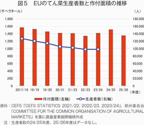 てん菜生産者は、2000年代初頭の約20万人から近年は約10万人へ半減している。作付面積は近年150万ヘクタール前後で推移しており、横ばいかやや減少傾向にある。このため、生産者1人当たりの作付面積は増加している(図5)。