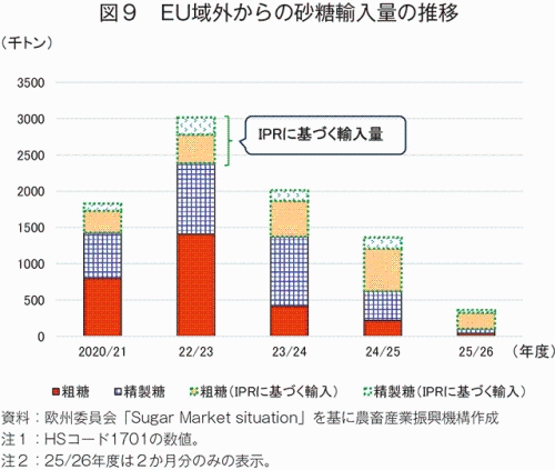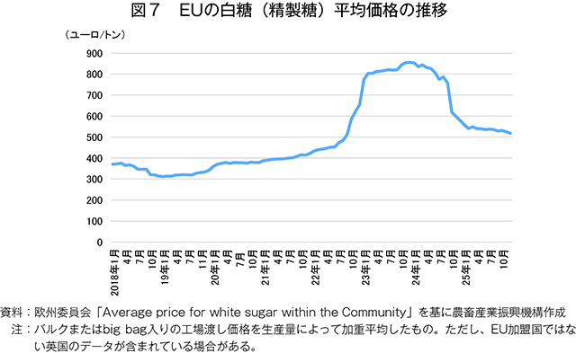 てん菜の作付面積は、砂糖相場が好調だった過去2年間には拡大したが、現在は世界的な過剰状態と相場低迷により減少傾向にある(図5)。2025/26年度の砂糖生産量は、世界の砂糖相場低迷に伴うEUの砂糖相場低迷により、てん菜作付面積が減少した結果、1603万トンと見込まれる(図6、7)。
