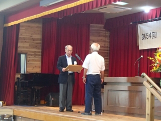 優秀集落の部で1位となった嘉鈍集落の代表者への賞状授与
