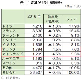 EUの農業は、共通農業政策(CAP)という、加盟国28カ国で共通の政策を導入しています。その中で、酪農分野では生乳クオータ制度という加盟国ごとの生乳生産量の上限を定めた生産割当制度が30年以上導入されていました。しかし、2008年のCAPの見直しにより、2015年3月31日をもってこの制度が廃止されました。廃止をにらみ、EU内では生乳の増産が図られてきましたが、時期を同じくして、ロシアがEUの乳製品を含む農畜産物の禁輸措置を講じたこと、中国の需要停滞などがあり、生乳や乳製品の価格が下がるなどして、生乳の主要出荷国であるドイツやフランスなどでは、牛の飼養頭数の減少が進みました。一方で、オランダ、アイルランド両国は、酪農を基幹かつ成長産業と位置づけ、飼養頭数、生乳出荷量共に増加させるなど、各国により状況が変化してきています。
