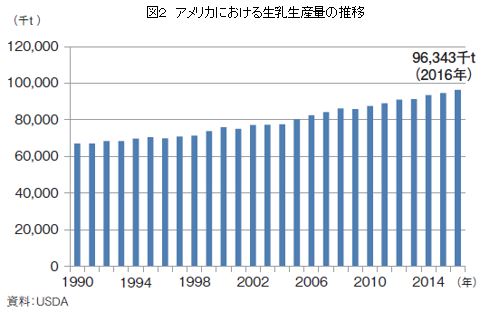 トウモロコシなどの飼料穀物価格が安価に推移していることなどから、近年、経産牛(出産を経験した牛。乳を搾るためには出産が必要。)の頭数は、増加傾向です。また、1頭当たりの乳量も、遺伝的改良や餌の品質向上などにより増加傾向となっており、その結果、アメリカにおける生乳生産量は、増加しています。
