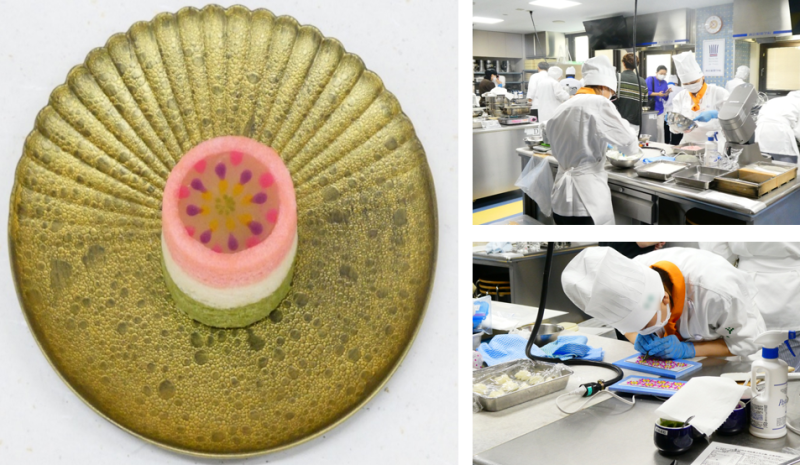 全国36校から101作品の応募があり、地区予選を勝ち抜いた11校12作品が決勝戦に進出しました。決勝戦では、制限時間1時間45分の中で、1個80グラム以内の和菓子を完成させるというルールで、熱戦が繰り広げられました。
