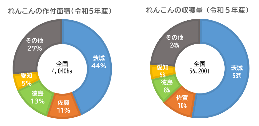 県別に生産量を見ると、第1位は茨城県、収穫量では約5割を占めています。第2位は佐賀県、第3位は徳島県となっています。