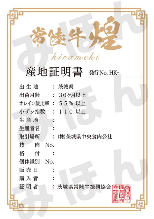 認定には、五つの条件「(1)茨城生まれ茨城育ち(2)月齢30カ月齢以上(3)歩留等級A等級のみ(4)オレイン酸比率55%以上(5)小ザシ