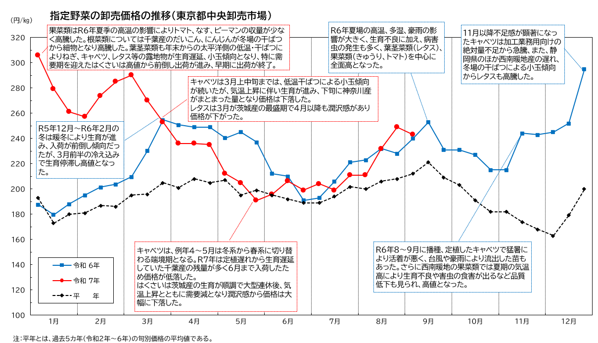 当機構から、令和7年の指定野菜の卸売価格について説明しました。3月まで多くの品目で高値が続きましたが、5月以降は残量が多く後続産地との出荷が重なったことから価格が下落しました。夏場は特に果菜類が猛暑の影響で出荷数量が伸びず、品薄感から価格は高騰しました。