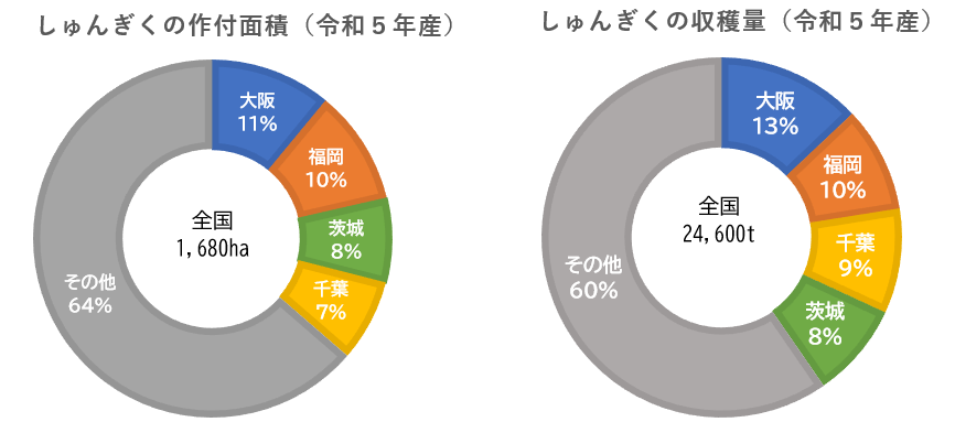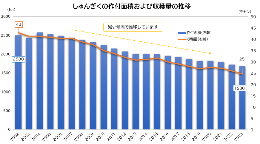 作付面積、収穫量ともに減少傾向で推移していますが、2023年におけるしゅんぎくの作付面積は1,680ha、収穫量は2万4600トンとなっています。