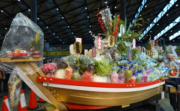 「初競り」というと魚河岸の一番マグロは、その高値が話題となりニュースなどで見たことがあると思いますが、青果部門でも、野菜の宝船が出て、大変な賑わいを見せます。