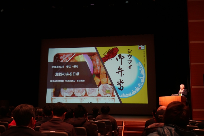 講習会終了後には、実需者と生産者の交流会としてばれいしょでん粉を使用した食品展示も行われました。ばれいしょでん粉は片栗粉だけでなくスープや練り物、飲料、菓子、麺類など私たちの身近な食品で活躍する縁の下の力持ちです。株式会社崎陽軒の君塚義郎常務取締役の講演では「他のでん粉では崎陽軒のシウマイの食感・風味が異なる」と、北海道産ばれいしょでん粉にこだわって使用している実需者の声が改めて伝えられました。
