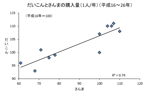 大根とさんまの食べ方には色々とありますが、大根おろしというと、さんまを連想する方も多いのではないでしょうか。機構が総務省の「家計調査」を基に、さんまと大根の購入量の相関を調べてみました。