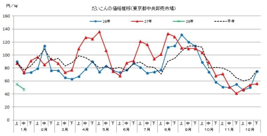 平成27年の大根の卸売価格は、年明け以降の低温にはじまり、天候不順の影響から平年を上回る価格で推移しました。9月以降は天候も回復したことから、それまで生育が遅れていた夏大根と秋冬大根の出荷が重なり、10月下旬以降平年を下回る価格となりました。