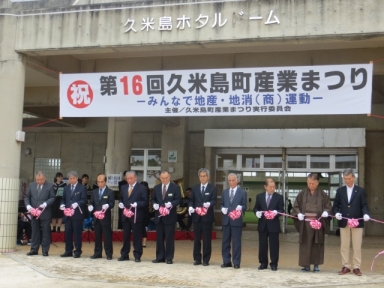 開会式のオープニングセレモニーでは久米島高校吹奏楽部による演奏が行われた後、同産業まつり実行委員長大田治雄町長ら関係者によるテープカット及び実行委員長から開会の挨拶があった。また、ドーム内において褒章授与式典及び過去1年間の実績が最も優秀な地区や個人、団体等に対する表彰が行われた。