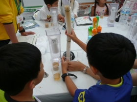 ろ過工程の実験では、精糖工場で一般的に行われている、原料糖を水に溶解した褐色の糖液をイオン交換樹脂や活性炭などに通しファインリカーと呼ばれる透明な糖液になるまでのろ過工程を家庭用浄水器などで代用し、模擬的に体験してもらった。ろ過実験により、褐色であった糖液が透明な糖液に変わる様子を観察してもらうことができた。