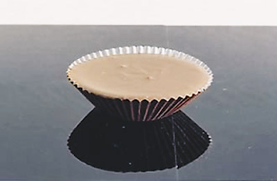 一般的には、あまり知られていませんが、オブラートは水には溶けても、油には溶けません。例えば、図3は、この性質を利用してカップ型に成型したオブラートに、チョコレートを流し込んでみたものです。ご覧の通り、オブラートは溶けることなく、チョコレートを包んでいます。