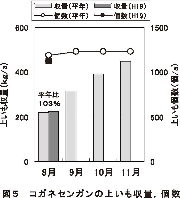 シロサツマ164kg/a(平年比109%)、コガネセンガン224g/a(平年比103%)は平年に比べやや高かった。しかし、シロユタカ196kg/a(平年比93%)、コナホマレ189kg/a(平年比94%)、ダイチノユメ240kg/a(平年比95%)は平年よりも少なかった。コガネセンガン、シロサツマは、いも個数は少なかったものの、肥大が良好でいも1個重が重くやや多収となっていた。その他の品種はいも個数が少なく、いも肥大は平年並みであったため平年以下の収量になった。