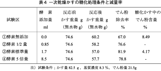 まず、糖化に必要な酵素の添加量について検討した。その結果を表4に示す。 でん粉除去率は、酵素を添加しない区で67%、酵素標準量の1/2量区で77%、5倍量で79%と酵素の添加量の違いは糖化に大きな影響を与えなかったことから、糖化時の酵素添加量は標準量の1/2量で良いことが明らかになった。