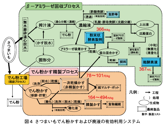 構築したβ−アミラーゼ回収プロセスとでん粉かす精製プロセスを既設のでん粉工場に組み込んだ「さつまいもでん粉かす及び廃液の有効利用システム」の概念は図4に示すとおりである。