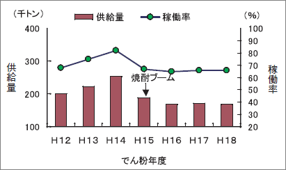 でん粉産業が最盛期であった昭和38年におけるかんしょの用途は、でん粉原料が大半を占め、116万トンのかんしょが410のでん粉工場によってすり込まれ、約30万トンのでん粉が生産されていた。前述のように糖化事情の変化に伴い、かんしょ生産は急減し、でん粉工場もとう汰され、現在では23の工場が操業し、14.5万トンのかんしょを処理、4.5万トンのでん粉を生産している(平成19でん粉年度)。23のでん粉工場のすり込み能力19.1万トンに対し、でん粉原料用かんしょは14.5万トンで、でん粉工場は慢性的な原料用いも不足の状況にある。平成15年頃からの焼酎ブームの到来で、この状況はさらに悪化している(図2)。