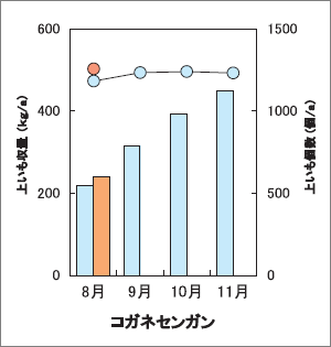 収量は1アール当たりコガネセンガン241キログラム(平年比110%)、シロサツマ167キログラム(同110%)、シロユタカ222キログラム(同106%)であり、平年に比べ多収であった。