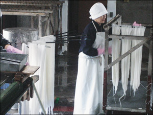同社での平成20年のでん粉使用量(内訳は、はるさめ6、片栗粉4の割合)は、例年に比べおよそ2割増加した。その理由として、通常国内で流通しているはるさめは中国産の緑豆由来のものが多いが、昨今の中国産食品に対する消費者の懸念の高まりから、国産ばれいしょでん粉を原料としたはるさめの需要が高まり、でん粉使用量が増加した。工場の従業員数は14人で、現在、通年フル稼働で従事している。
