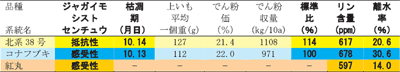また、「北育13号」のでん粉特性は、リン含量、離水率が「コナフブキ」より低く「紅丸」並で、品質がすぐれる(表3)。