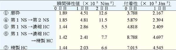 物性値と実際の食感との関係を表7にまとめた。精製ハイドロサイクロンでん粉は、適度な弾力感とやわらかさを感じ、ノズルセパレーターでん粉と比較して保存期間を通して好ましい食感であった。ノズルセパレーターでん粉は弾力感に乏しく、特に保存後期は非常に硬く、最も老化が進んでいるように感じた。市販でん粉は、瞬間弾性値の変化は小さいが、非常にもろい食感で、老化速度のみでは説明できなかった。調製シロユタカでん粉は、保存期間を通して弾力感があり、ゲルの老化は遅いように感じられた。
