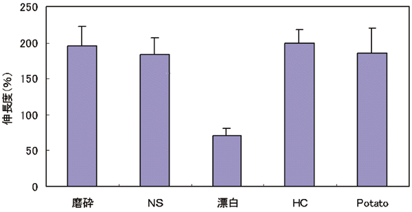 ※9 スクリューが一本の押し出し装置、加熱と加圧を同時に行い麺を形成する製造工程別に調製したでん粉の麺の物性を比較し、図6に麺の凝集性、図7に麺の伸長度を示した。麺の復元力すなわち噛みごたえを示す凝集性は、漂白工程の麺が低く、噛みごたえのない麺と評価された。磨砕工程、ノズルセパレーター工程ではほとんど差はみられなかった。ハイドロサイクロン工程の麺は、凝集性がやや高いが、有意差はなかった。麺の伸長度についても、漂白工程の麺の伸長度が顕著に低く、伸びがなくコシの弱い麺であった。磨砕工程、ノズルセパレーター工程、ハイドロサイクロン工程については伸長度が高く、ばれいしょでん粉の麺より伸長度が高いことから、冷麺としての良い特性を持っていると考えられた。