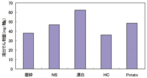 図8に製造工程別に調製したでん粉の麺の煮溶けを比較した。煮溶けは、磨砕工程、ノズルセパレーター工程、漂白工程では、製造工程後半になるほど煮溶けが多く、でん粉粒子の損傷に起因すると考えられた。ハイドロサイクロン工程の麺については、煮溶けが少なく、麺調製時のでん粉へのダメージが少ないと考えられた。麺の凝集性、伸長度、煮溶けの結果から、漂白工程のでん粉については、製麺適性が劣ると考えられた。ノズルセパレーター工程のでん粉については、煮溶けに粒子損傷の影響がわずかにみられるが、製麺適性が著しく劣るものではなかった。