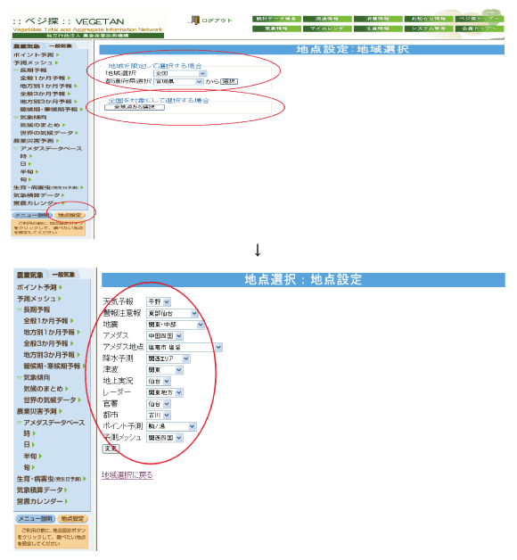 また、会員登録を行った方は、一般画面の内容に加え、農業気象情報として、(8)ポイント予測 (9)予測メッシュ (10)長期予報 (11)気象動向 (12)農業災害予測 (13)アメダスデータベース (14)生育・病害虫予測 などを調べることができます。