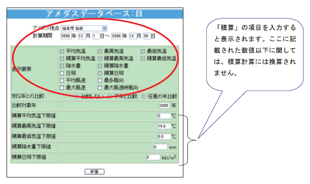 (4)計算結果が表示されます。使用されるデータは、当該年の実績データと過去の平年値です。