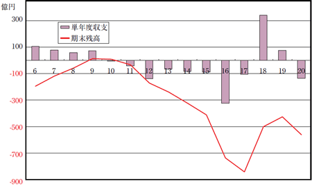砂糖年度は10月から9月までですが、機構の法人としての事業年度(4月から3月)でみた調整金収支は、以上のような収入と支出の状況により、20年度には135億円の単年度赤字となり、21年度にも、それを上回る単年度赤字が予想されます。