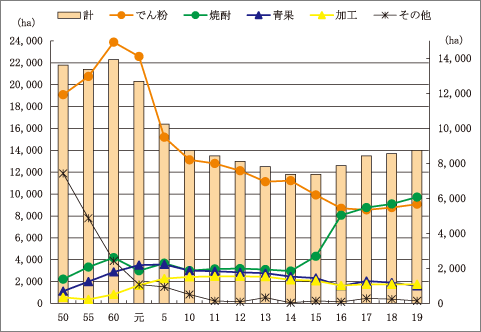さつまいもの栽培面積は、昭和38年の71,500haを最高に年々減少し、平成15年は11,800haまで減少したが平成16年からは焼酎ブームなどの影響もあり増加傾向にある。