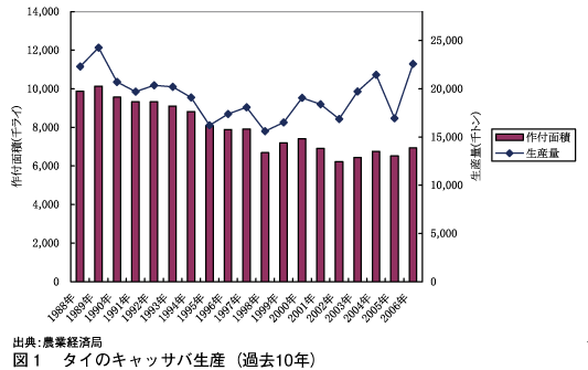 タイのキャッサバ作付面積は、1988年の987万9,000ライ(1ライ=約1,600m2)から2006年には669万3,000ライへと32.25%減少している。しかし、ライ当り単収は、2,258キロから、3,375キロに49.47%の増加となっているため、生産量は、2,230万7,000トンから2,258万4,000トンに1.24%増加している。