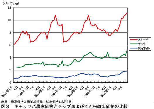 タピオカでん粉の価格は2001年から2007年にかけてキロ当たり6〜11バーツの間を上下しているが、世界のでん粉相場の影響を強く受けるため、キャッサバ農家価格の動向とは連動していない。一方、チップはキャッサバ価格の上下にほぼ連動している。でん粉、チップともに、2007年11月時点では、世界の飼料穀物価格高騰に従い値上り傾向にある。