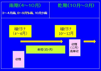 施肥・植付けは5月または9月、収穫は8月〜12月に行っており、基肥と追肥はそれぞれ1ライ当たり50キログラムを施肥している。乾期である1月は土壌が硬くて収穫は不可能である。